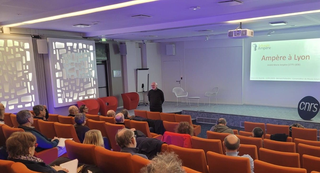 Ce lundi 12 janvier, a eu lieu la première conférence de l'année consacrée à Ampère dans le cadre du cycle de conférences "Sciences et Histoire "de l'université ouverte - Lyon1. "Ampère à Lyon" est le sujet proposé par Bernard Pallandre, conservateur du musée Ampère.